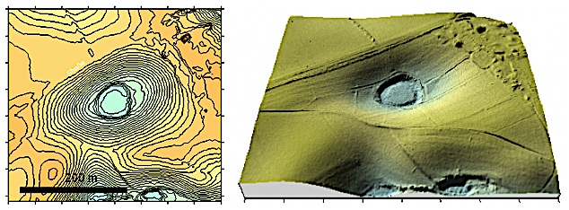 Angebliches Toteisloch, Geotop des bayerischen LfU. – Airburst-Impaktkrater im Digitalen Geländemodell DGM 1. Stark überhöht. Durchmesser Wall zu Wall 50 m. Ein diametrales Profil zeigt Zentralhügel und peripheren Muldenring.